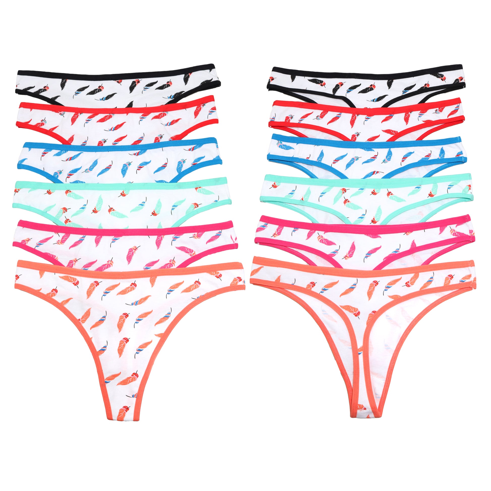 Angelina Cotton Thong Panties with Feather Print Design (12-Pack), #G6495
