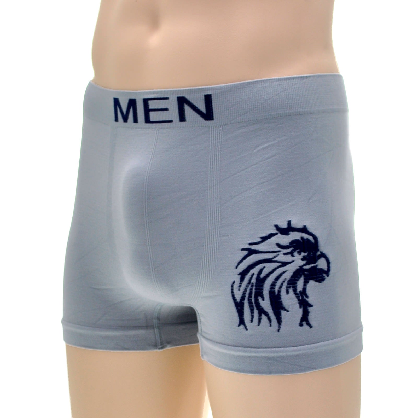 These seamless boxer briefs have a hawk image on left leg and the word "MEN" spelled at the waist. Soft, smooth, and stretchy material great for everyday wear. Available in multiple colors. 90% Nylon 10% Spandex. Machine wash in under garment bag. Line dry. For better results hand wash.