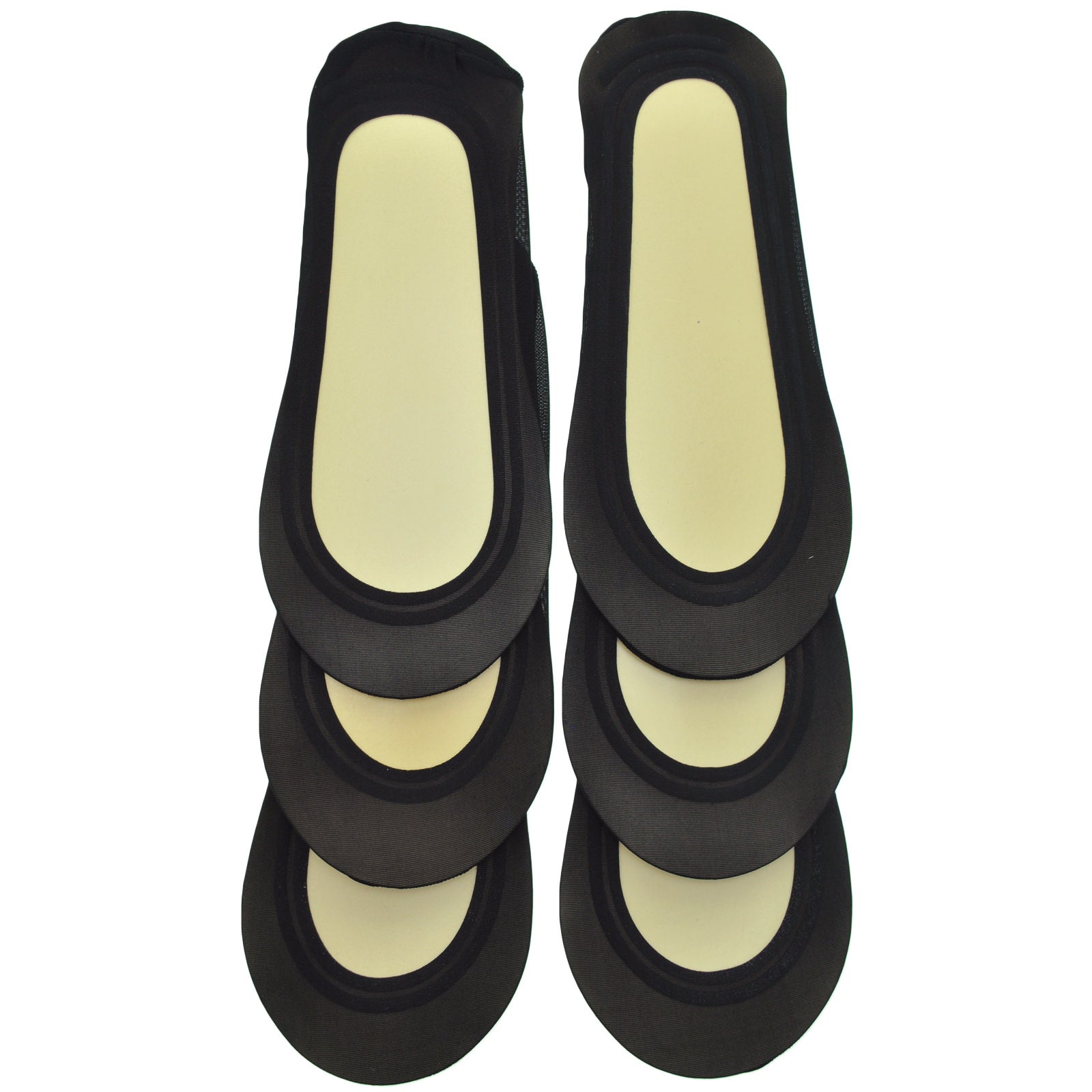 These lightwight no-show socks have a lasercut edge finish for maximum comfort come with a silicone non-slip edge around the top to keep the socks in place. They feature a breathable cotton sole with silicone gripper dots for traction. Choose between a 6 pack of Black or Beige socks. Available in women's one size 9-11. Made of 65% Cotton, 25% Nylon, and 10% Spandex. Machine wash, tumble dry low.