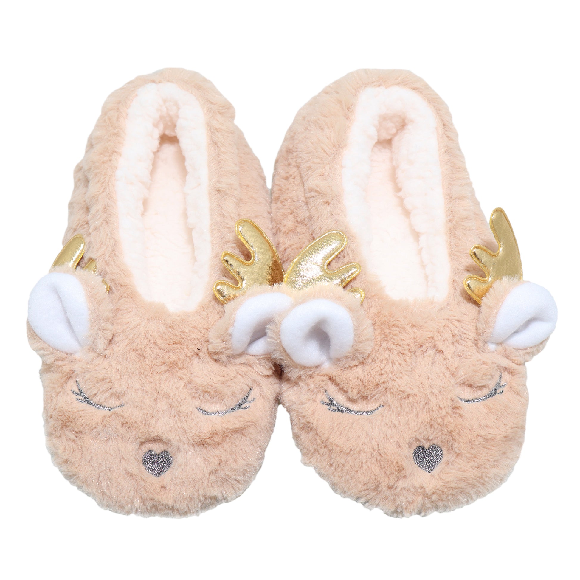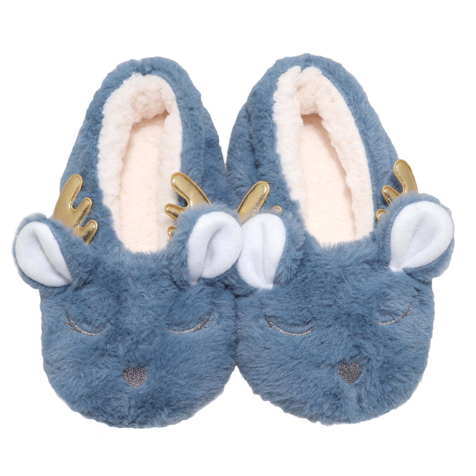These winter-weight indoor slipper socks feature a variety of cute deer designs with 3D antlers. The sherpa-lined interior provides maximum warmth and comfort during the cold seasons. They come with a durable microfiber sole and anti-slip rubber grips. They are comfortable for wearing with any sleepwear while lounging around the house. Available in a 3-pair pack of 3 different colors. Women's one size fits most. Made of 100% Polyester. Machine wash gentle cycle, line dry. For better results, hand wash.