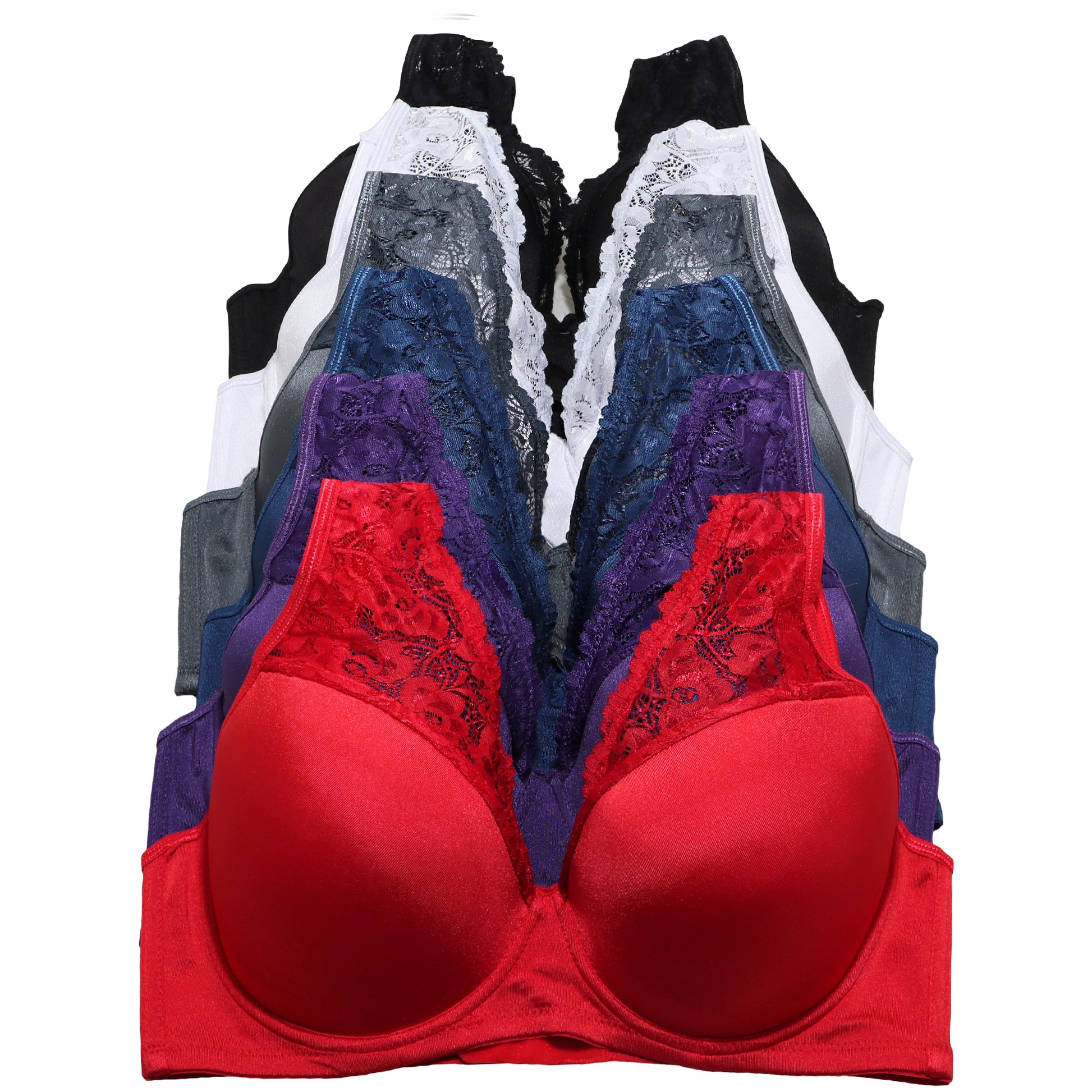 These extended size bras feature wired, lightly padded cups with an elegant lace accent detail on the cups and straps. The extra wide straps and 4 rows of hook-and-eye back closure ensure a better fit. Available in a 6-pack value bundle of 6 different colors. Comes in sizes 34D-42D, 34DD-42DD, and 34DDD-44DDD. Made of 85% Polyester and 15% Spandex. Machine wash in lingerie laundry bag, line dry. For better results, hand wash.