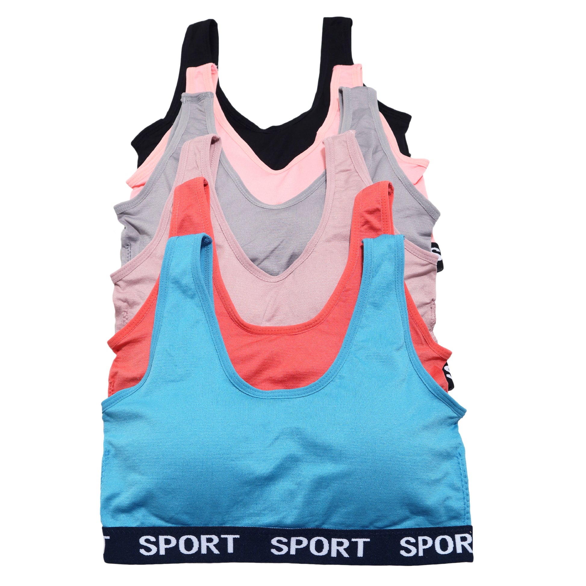 These seamless bralette feature a "Sport" print design on the durable, elastic under bust band. The seamless construction provides maximum comfort for all day wear. The double layer front comes with optional removable cups. Available in a 6-pack value bundle of 6 different colors. Comes in S/M and L/XL. Made of 90% Nylon and 10% Spandex. Machine wash in lingerie laundry bag, line dry. For better results, hand wash.