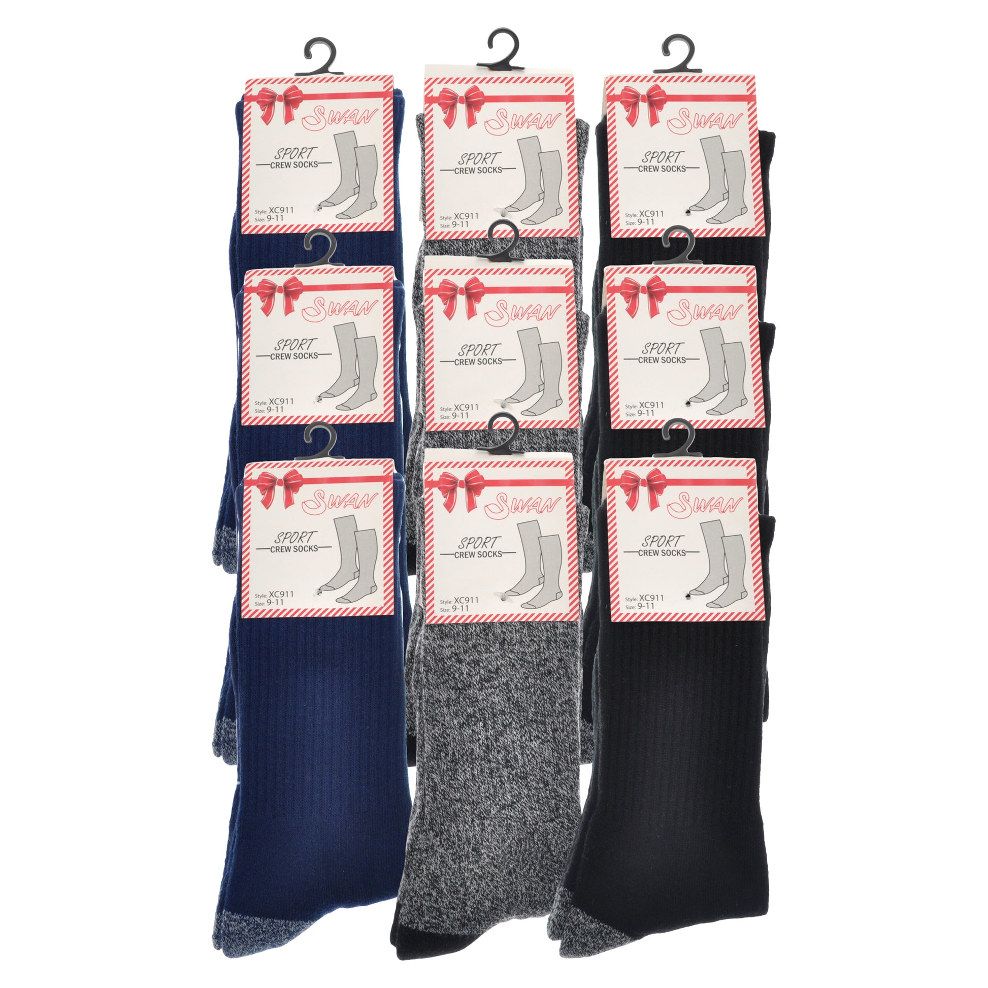 These Swan brand UNISEX sport socks are made with a SOFT AND ABSORBENT terry cloth material designed for any kind of sport performance. The rib knit ARCH SUPPORT as well as the GENEROUS HEEL AND TOE construction provide BETTER SUPPORT AND FIT. Available in a BUNDLE PACK of assorted colors. Available in women's one size fits most and men's one size fits most. Made of 80% Cotton, 12% Polyester, and 8% Spandex. Machine wash, tumble dry low.