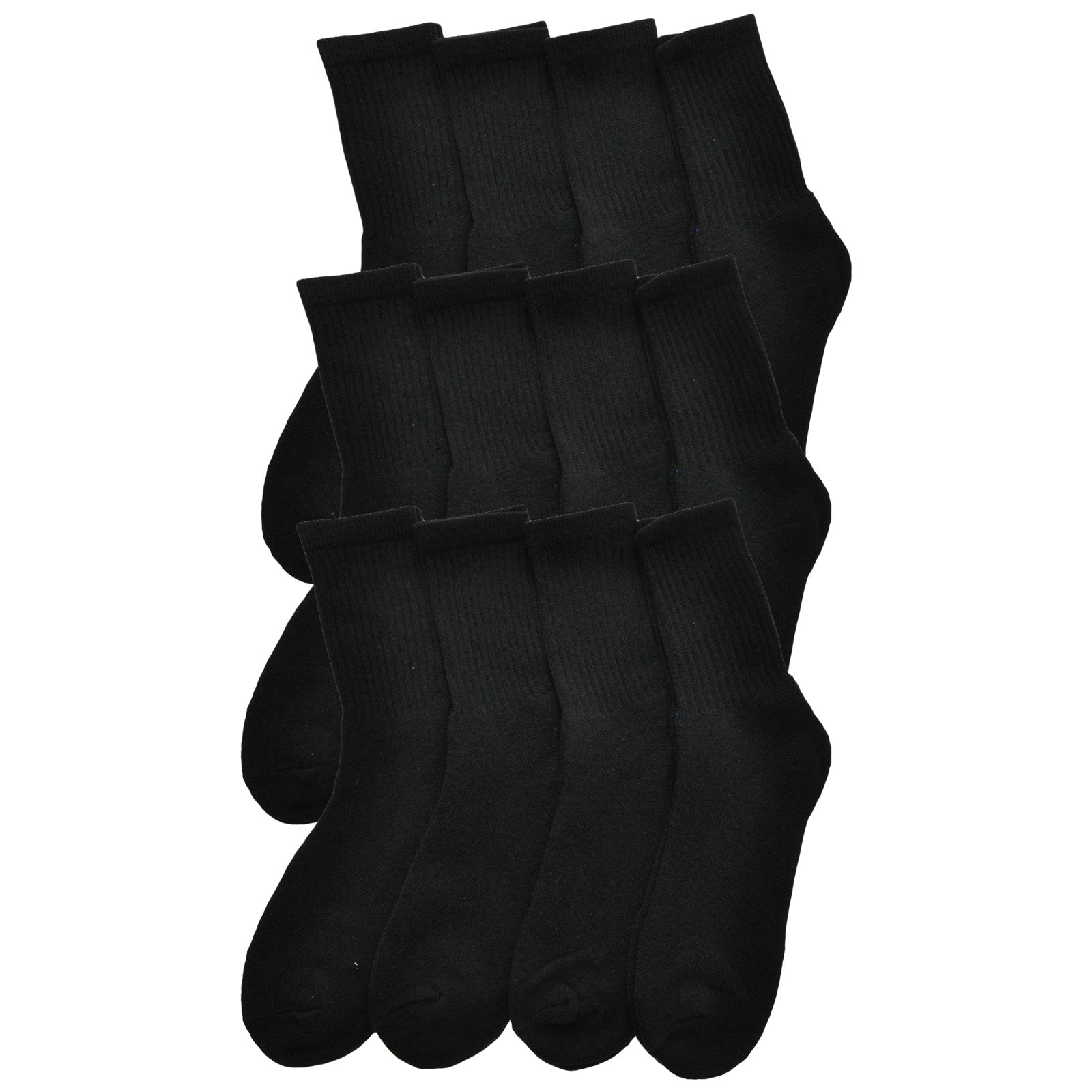 These unisex cotton blend sport socks are made with a soft, and stretchy material to provide maximum comfort. They are crew length with rib knit cuffs to help keep socks in place. Available in 12 pack of black. S/M fits womens shoe size 6-9.5 or mens shoe size 8-10.5. Made of 77% Polyester, 20% Cotton, 3% Spandex. Machine wash, tumble dry low.
